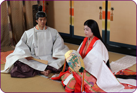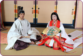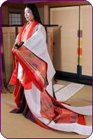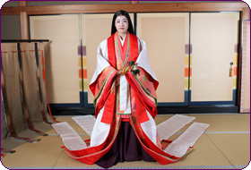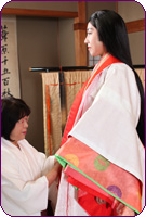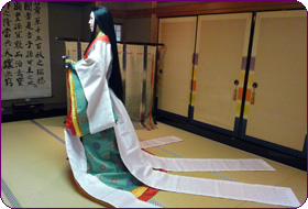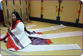 かざみには、二つの着方がございます。帯を締めるのが、正式な着方という説がございまして、帯を締めないのは、宿直(とのい)姿という着方で、小野小町は、この着方をしていたようです。