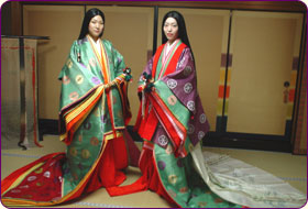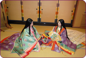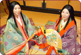 平安時代は身分の高い方ほどくつろいだ衣装を着るため、中宮の装束は小袿(こうちき)でした(裳唐衣のときもありました)。長袴、単、五衣、表着、小袿を着て、桧扇を持ちます。(夏は「蝙蝠(かわほり)」という扇をもちました。)