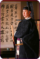 体験所では、縫腋束帯の平緒、太刀をつけた姿の体験をしていただきます。 着付けの順序は次のようになります。