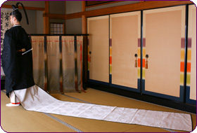 縫腋は、袍の両脇が縫ってあり、すそに襴(らん)がついております。文官ならびに三位以上の武官が、お召しになる衣装でした。