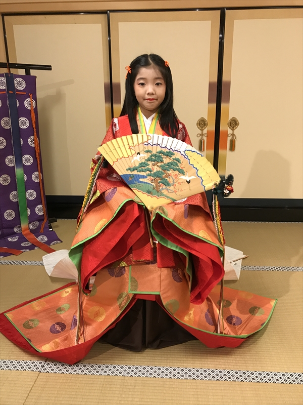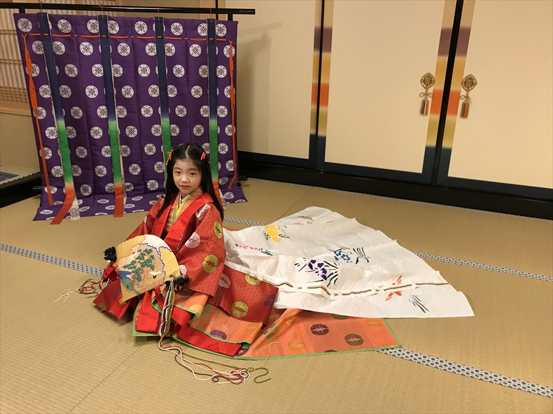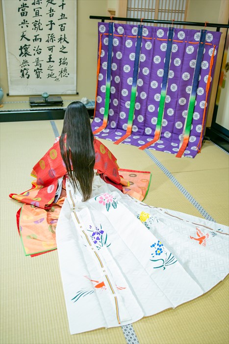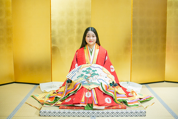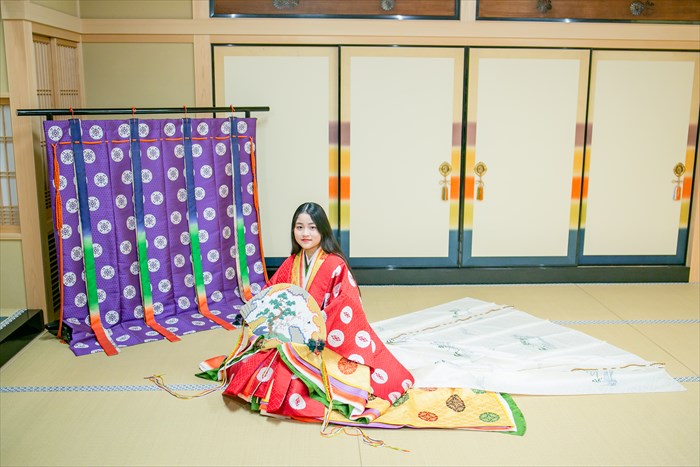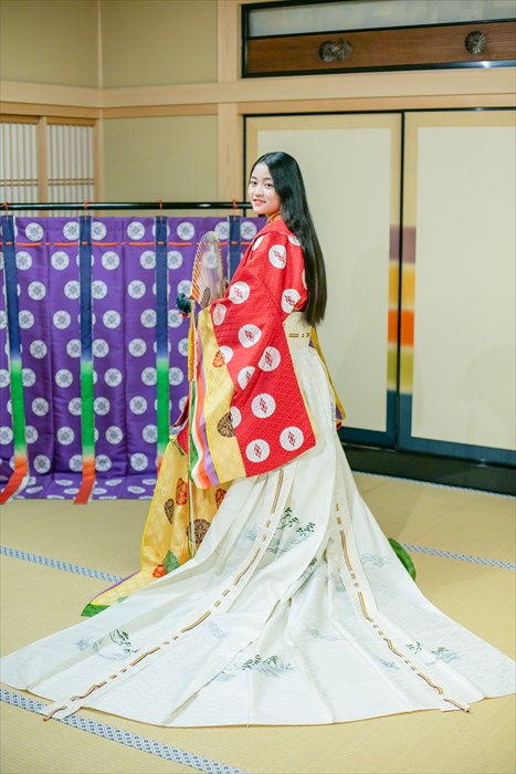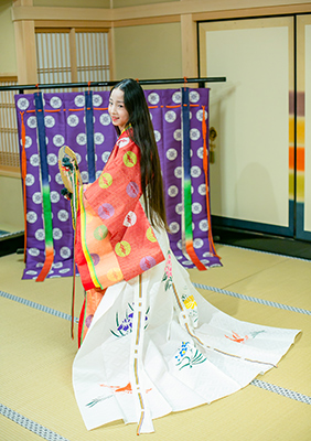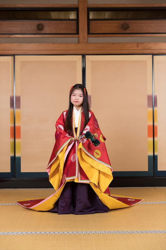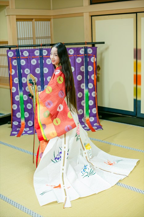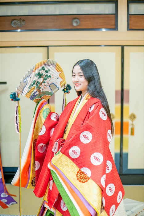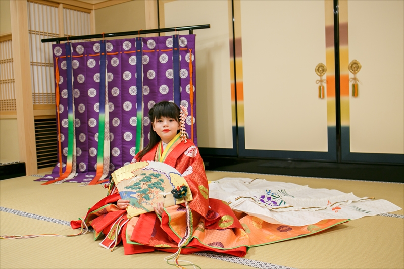 十二単にあこがれるお嬢様に平安時代の裳儀の十二単姿です。