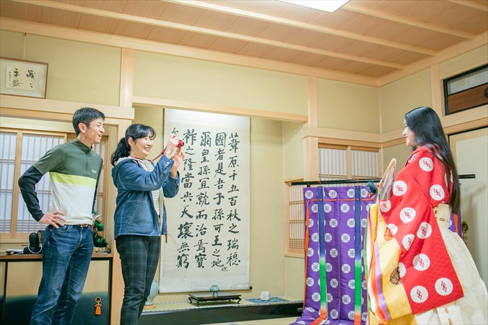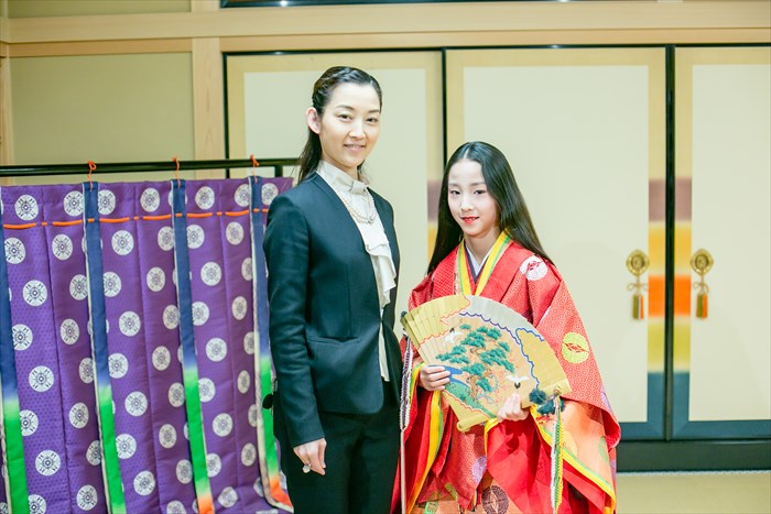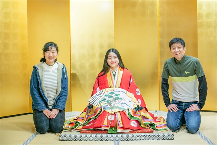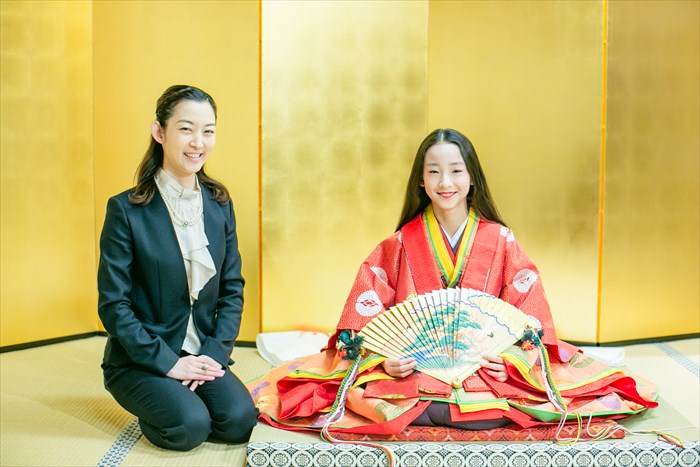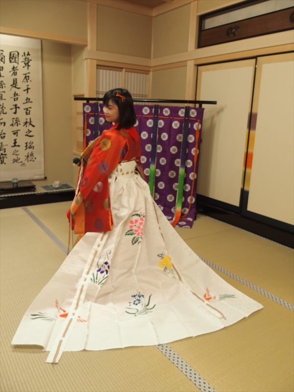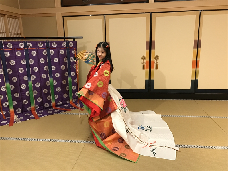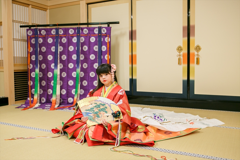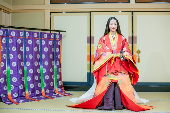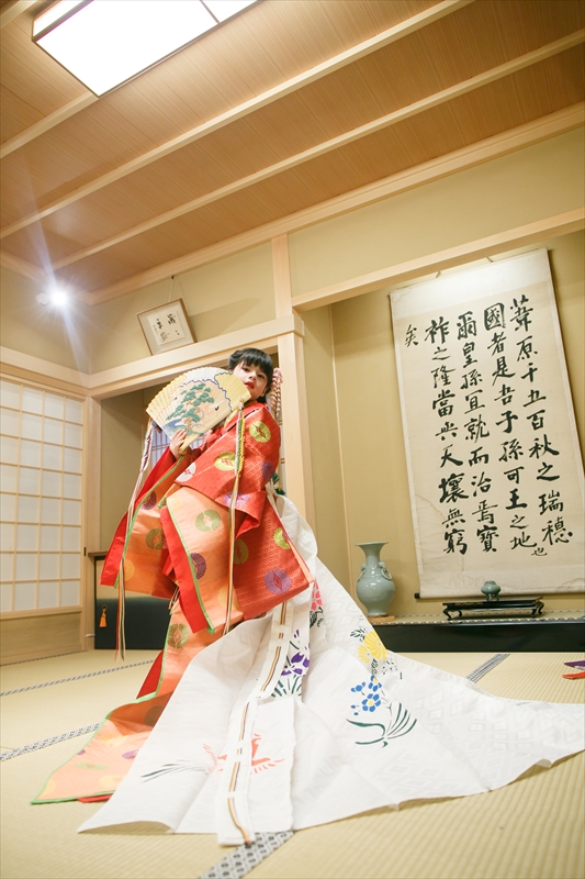 十二単にあこがれるお嬢様に平安時代の裳儀の十二単姿です。